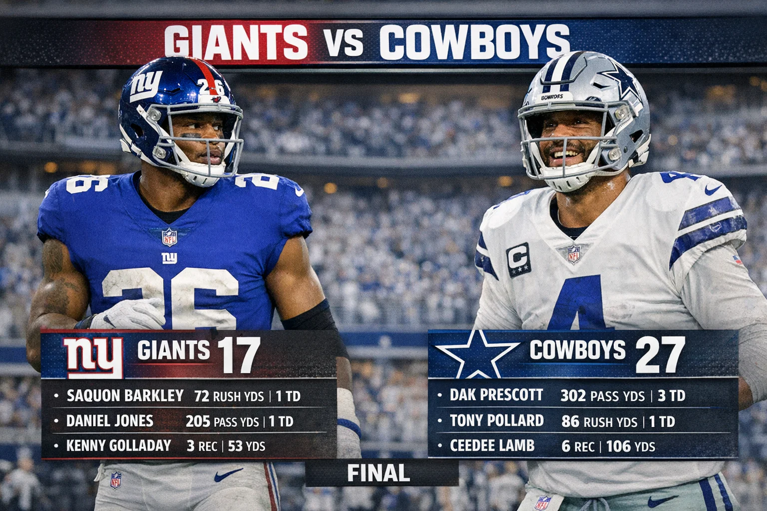 Now it is your turn to join the conversation. Which player impressed you the most in this game? Do you think the stats tell the whole story? Share your thoughts with other fans and keep the discussion going. The rivalry between the New York Giants and Dallas Cowboys will continue for years to come. Every game adds new stats, new memories, and new reasons to love football. Check back after the next matchup for more detailed player stats and analysis.